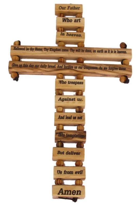 A beautiful way to display the Lord’s Prayer in your home or office. Handmade in the Holy Land, this unique, inspirational cross features the Lord’s Prayer on 12 olive wood plates carved from olive trees, and strung together with olive wood beads. Available in Small, Medium, or Large sizes. This would make a wonderful gift!